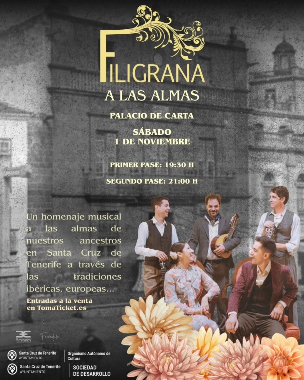 Este año, pues, Filigrana comenzará esta serie de recitales en Arucas el próximo viernes 17 de octubre a las 20 h en el Nuevo Teatro Viejo, dentro de la programación del Festival Divina Muerte. Continuará con una gira por Santa Cruz de Tenerife, que tendrá como escenarios distintos centros comunitarios, como el de Valleseco el sábado 25 de octubre, el de El Sobradillo el 7 de noviembre y el de Ofra el 8 del mismo mes; recitales que se celebrarán a las 19 h. Por su parte, el Palacio de Carta, en el centro de Santa Cruz, acogerá dos funciones el propio Día de Difuntos, el 1 de noviembre, a las 19:30 h y a las 21 h. En medio de estas citas capitalinas, el público del norte de Tenerife podrá disfrutar de «A las almas» el viernes 31 de octubre a las 20:00 h en el Museo de Artesanía Iberoamericana de Tenerife, así como el del sur en el Centro Cívico de Cabo Blanco (Arona) el miércoles 29 de octubre a las 20:00 h.