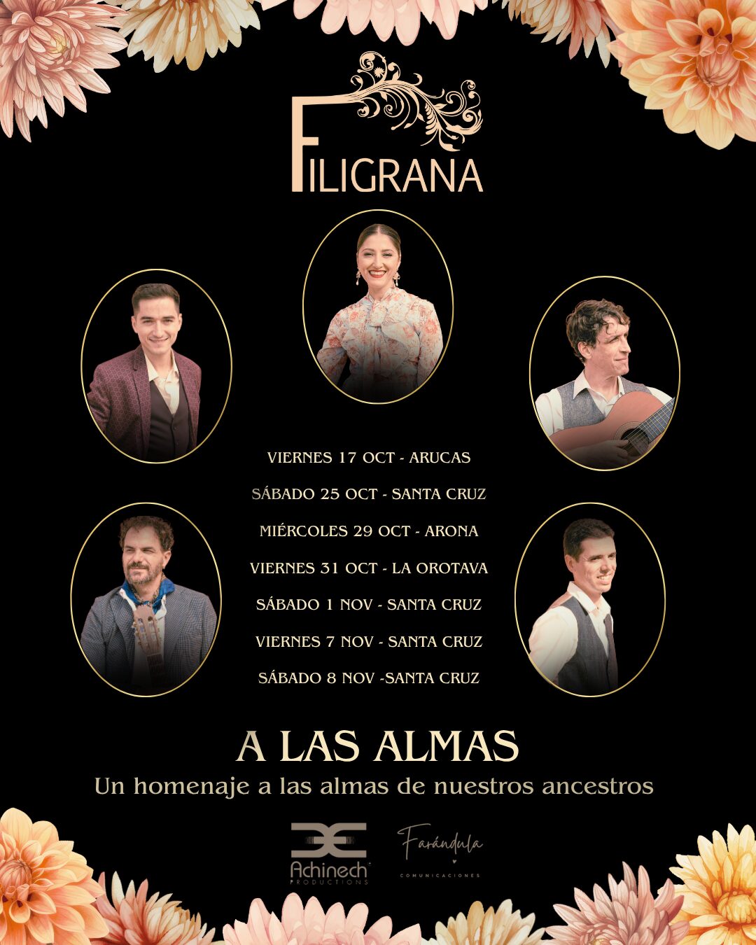 Este año, pues, Filigrana comenzará esta serie de recitales en Arucas el próximo viernes 17 de  octubre a las 20 h en el Nuevo Teatro Viejo, dentro de la programación del Festival Divina Muerte.  Continuará con una gira por Santa Cruz de Tenerife, que tendrá como escenarios distintos centros  comunitarios, como el de Valleseco el sábado 25 de octubre, el de El Sobradillo el 7 de noviembre  y el de Ofra el 8 del mismo mes; recitales que se celebrarán a las 19 h. Por su parte, el Palacio de  Carta, en el centro de Santa Cruz, acogerá dos funciones el propio Día de Difuntos, el 1 de  noviembre, a las 19:30 h y a las 21 h. En medio de estas citas capitalinas, el público del norte de  Tenerife podrá disfrutar de «A las almas» el viernes 31 de octubre a las 20:00 h en el Museo de  Artesanía Iberoamericana de Tenerife, así como el del sur en el Centro Cívico de Cabo Blanco  (Arona) el miércoles 29 de octubre a las 20:00 h.