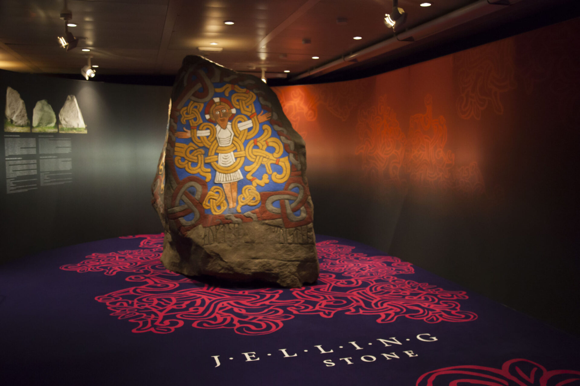 La gran piedra de Jelling, a menudo calificada de “certificado de nacimiento de Dinamarca” fue erigida para proclamar el bautismo del rey y, con ello, el establecimiento del cristianismo como religión oficial de Dinamarca. El Cristo representado en ella no aparece como la figura doliente que sería habitual siglos después. Este Cristo está representado un monarca victorioso. La piedra está enclavada en un emplazamiento aproximado al que ocupaba el original, en medio de los dos túmulos funerarios de Jelling.