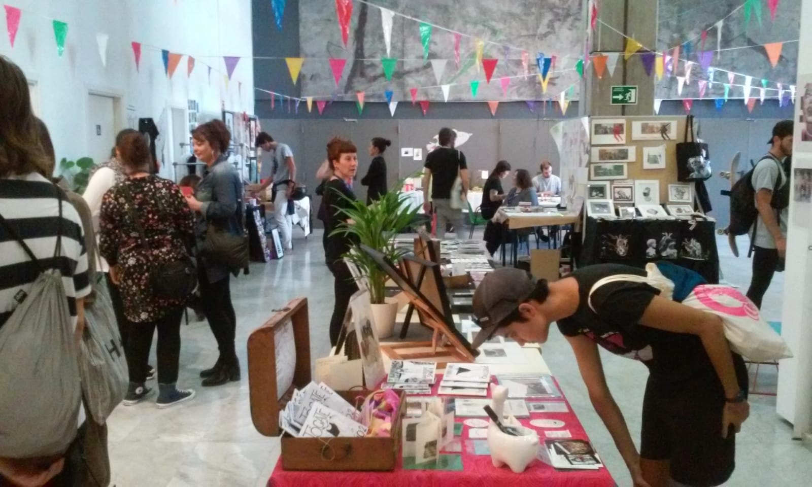 Iniciativa sorprendente y elogiable, enfocada a la confección del Fanzine; casi una pieza de museo en la era digital que nos asola. Presentado por Ivan Retamas, el evento en si comenzó a las dos con la implantación de mesas y puestos, tanto de venta como talleres de facturación, collages y un magnifico despliegue de ejemplos expuestos (desde Cocaint hasta Destroyer). Hubo para todos y todas, y el nivel artístico era demoledor. Todo esto era en el hall. Afuera, aparte de los consabidos food trucks y cantinas, se encontraban tiendas de serigrafía, exposición de láminas, camisetas, etc… Aquello empezó a animarse al mediodía, y a tomas visos de verdadero festival.