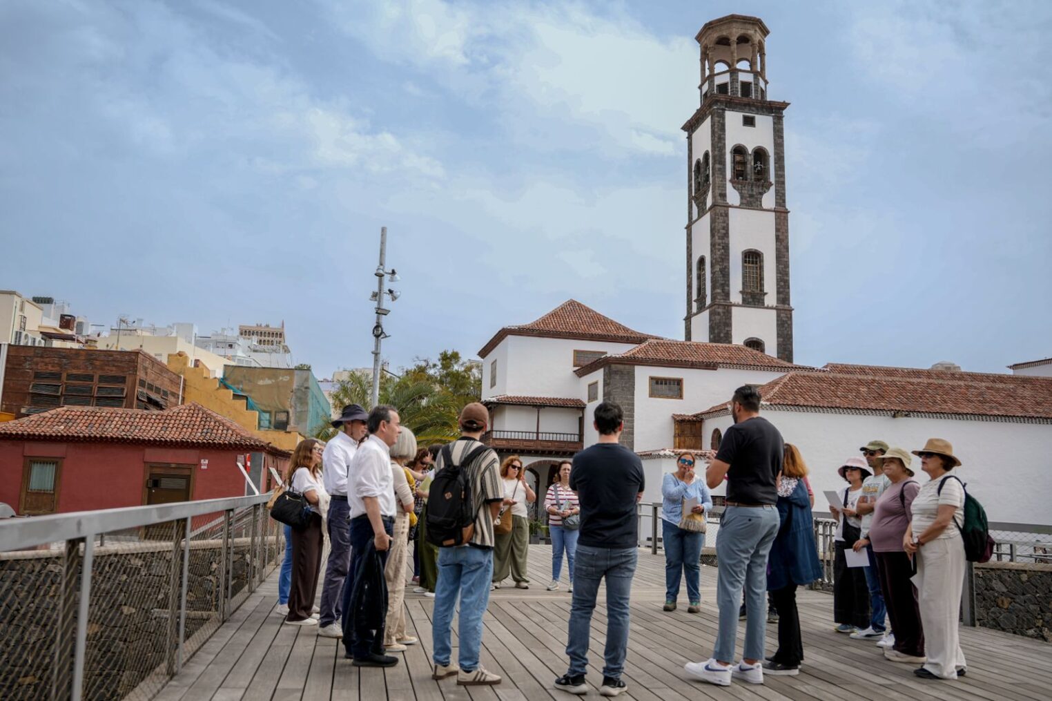 El tour finalizó en la exposición de la obra de Marika Vila que se encuentra en la planta superior. Allí, el grupo tuvo la oportunidad de degustar el Marmajuelo Blanco de Viña El Drago, una bodega adscrita a la Denominación de Origen Tacoronte-Acentejo. Esta es una de las claves de Ciudades a Pie: enriquecer la experiencia cultural con el sector primario local. Al acabar, las personas que lo desearon pudieron acceder a la azotea, finalizando la mañana con unas estupendas vistas al Barranco de Santos, al puente Serrador y al edificio del Tenerife Espacio de las Artes.