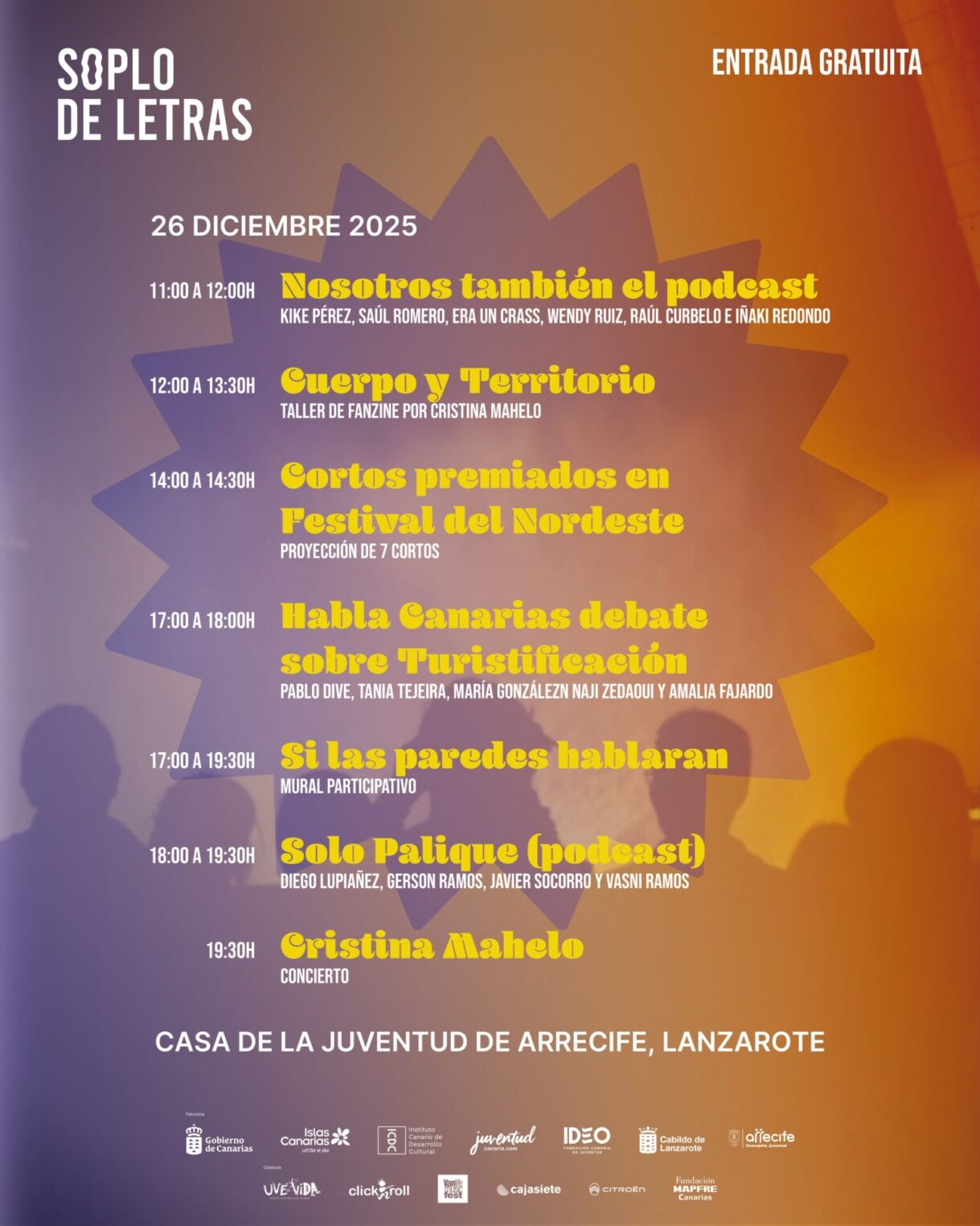 Kike Pérez, Diego Lupiañez de Abubukaka, Solo Palique, Cristina Mahelo, Pablo.Dive … forman parte del espectacular cartel que ofrece ‘Soplo de Letras’, el viernes 26 de diciembre desde las 11:00 hasta las 21:00 horas.